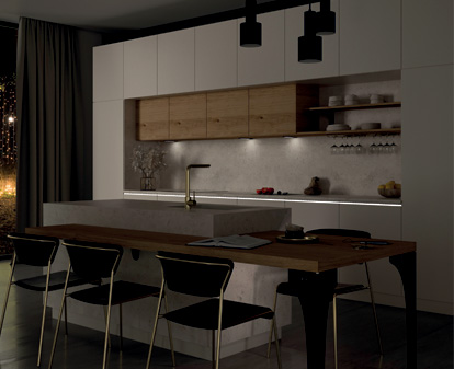 Votre cuisine est un espace de travail où vous avez besoin d'un éclairage fonctionnel avec une luminosité blanche, assez forte, pour bien voir ce que vous faites. Mais c'est aussi un lieu de vie où vous voulez une ambiance plus douce et chaleureuse, et la lumière jaune est alors plus adaptée ! Aujourd’hui, il existe des variateurs pour ajuster l’intensité lumineuse en fonction de vos besoins et du moment de la journée.