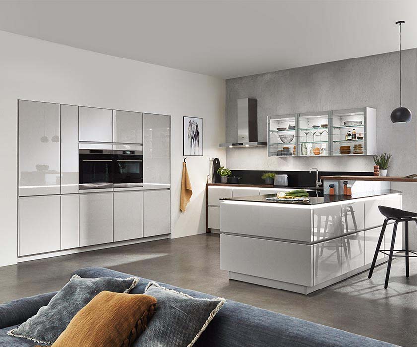 Notre large gamme de matériaux a été pensée pour convenir à tous les goûts. Les façades brillantes et leur effet miroir sont idéales pour agrandir l’espace, tandis que des portes mates à l’aspect texturé créent une atmosphère structurée et chaleureuse. Autre tendance, la finition peau de pêche anti-traces qui convient tout particulièrement aux familles en quête d’un matériau facile d’entretien.