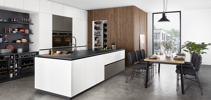 Le bois apporte immédiatement une dimension chaleureuse et naturelle qui adoucit cette pureté. Sa présence crée une ambiance conviviale invitant au partage, tandis que le grain unique de chaque essence raconte une histoire humanisant l'espace moderne. Qu'il s'agisse d'un plan de travail massif, de façades texturées ou d'éléments décoratifs, le bois instaure un équilibre rassurant entre nature et modernité.
