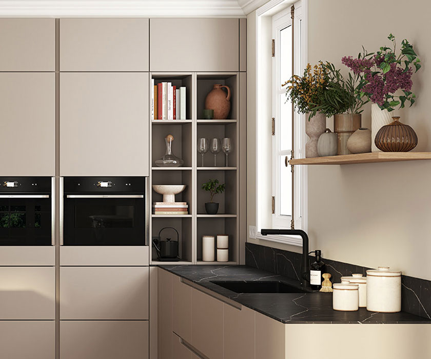 Les lignes sobres des colonnes murales, le plan de travail sombre accompagnent l’espace tout en douceur. L’ensemble crée une atmosphère apaisante, végétales inspirée du style japandi, où chaque détail est pensé pour faire rimer sérénité et fonctionnalité.