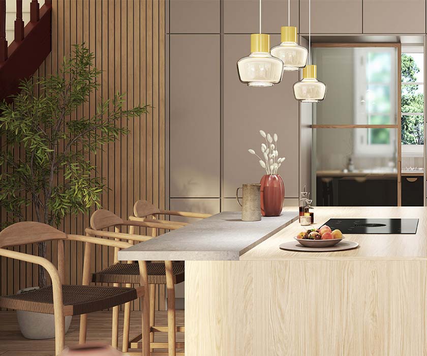 Dans votre cuisine CUSHY JAPANDI, l’îlot central en bois prolonge naturellement la table ronde pour dessiner un grand espace de partage où l’on circule librement. Les façades claires, le plan de travail sombre et le parquet coordonné créent un ensemble lumineux et chaleureux, renforcé par quelques touches de couleur et les lames bois verticales qui structurent le mur.