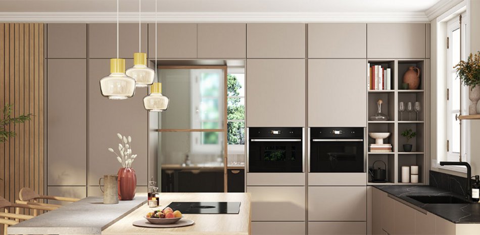 Dans votre cuisine CUSHY JAPANDI, les façades aux tons clairs s’associent à la chaleur du bois pour composer un décor à la fois naturel et élégant. L’îlot central en bois devient le cœur de votre pièce de vie, idéal pour préparer, prendre un repas sur le pouce ou partager un moment convivial.