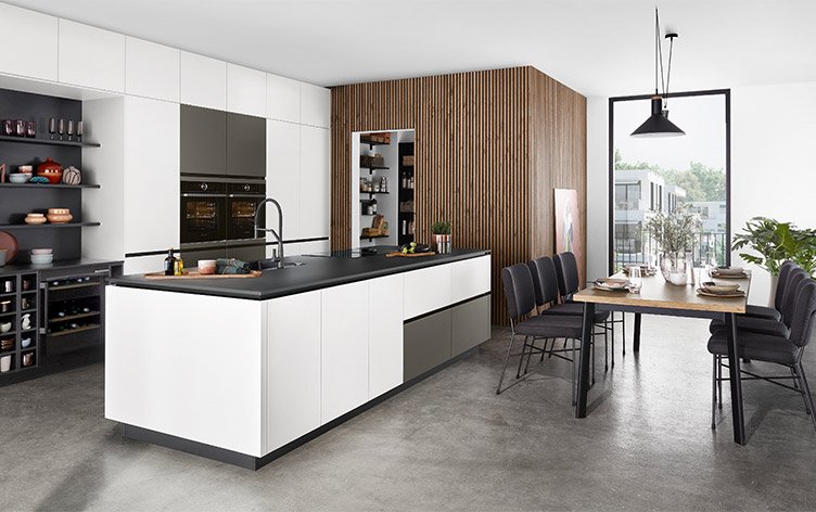 Le bois apporte immédiatement une dimension chaleureuse et naturelle qui adoucit cette pureté. Sa présence crée une ambiance conviviale invitant au partage, tandis que le grain unique de chaque essence raconte une histoire humanisant l'espace moderne. Qu'il s'agisse d'un plan de travail massif, de façades texturées ou d'éléments décoratifs, le bois instaure un équilibre rassurant entre nature et modernité.