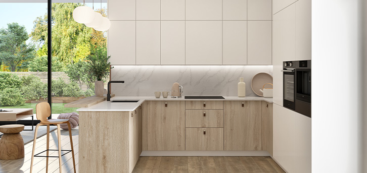 - Bois clair, granit compact, quartz, verre trempé : ces matériaux s’associent pour une cuisine durable, simple à entretenir et résolument contemporaine.