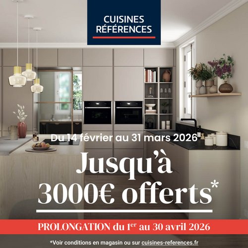 En ce moment dans votre magasin Cuisines Références, profitez de notre prolongation avec toujours jusqu'à 3000€ offerts sur votre projet de cuisine ou d'aménagement intérieur.